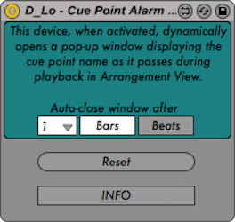 | Description: | This device alerts the user when Lives clock passes over a cue point in arrangement view by displaying the cue points name in a pop-up window. The window automatically closes after a user-determined period of time. Be sure to click this devices reset button if you add, move, remove, or change the name of any of your cue points. The concept for this device was dreamed up by Spacebar: https://www.youtube.com/watch?v=3KNiCuwoMro Enjoy responsibly! |