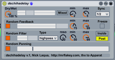 | Description: | Based on code from Apparat/Modeselektor's performance patch "dschihad", dschihadelay is a single tap delay (synced to Live transport) with random delay time, random feedback (+feedback freeze), random filter cutoff (lowpass, highpass, bandpass, bandstop) and random panning. It is now fully stereo (both channels are processed), allows to choose either to output a wet/dry signal or just the wet signal. The Filter can be placed either within the feedback loop, after the delay unit or in both places. The boundaries of the ranges can be automated in Live via the sync'ed min/max dials. |
