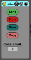 This is a MIDI device I use to allow use of my midi pedals for any control. Put this on a MIDI track and route all control surfaces (apart from your pedal board) through this track and out to a loopMIDI port or similar, then back into live as a control surface. The pedal has four controls which you should map to pedals on your board (though you may not need them all). Store saves any messages sent through the device without passing them on, they are then quickly sent in order using the send button and normal flow of midi information through the device resumes. Save can be pressed after storing MIDI events to resume normal flow of information, the messages can then be sent at any time. Finally, copy does the same thing as store, but passes on the information at the same time. This is useful for recording loop clips (press copy, start loop recording, press send to start looping).