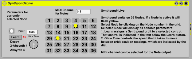 | Description: | Synthpond4Live connects the OSC output of Zach Gage's excellent and fun iOS app "Synthpond" to Ableton Live via Max4Live. More info on Synthpond here: http://apps.stfj.net/synthPond/ The OSC data generates Note info for each placed "Node" in Synthpond, and generates CC data for any Node that has been set in "Orbit" in Synthpond. Synthpond emits on 36 Nodes. If a Node is active it will flash yellow in the Node grid in the M4L patch. Select Node by clicking on the Node number in the grid. Selected Node will display its editable parameters: 1. Learn assigns a Synthpond orbit to a selected Live control. That control is indicated in the text below the Learn button. 2. Glide Time controls the speed that it takes to move between orbit position readings, which are indicated by the dial. MIDI channel can be selected for the Note output. Synthpond4Live makes use of the CNMAT OSC Route object. This device is Mac and Windows compatible. |