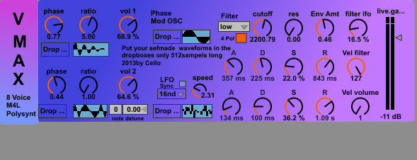 | Description: | A 8Voice Polysynt. 2 Osc with phasemodulation Filter with Lfo For other waveforms put 512 sampel waves in the Dropboxes. Have fun Cello |