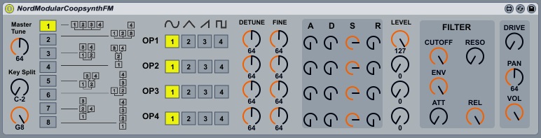 For Nord Modular G1 users, I have made an FM synth patch and this M4L plugin to control it. It is a 4 operator FM synth with 8 algorithms, ADSR envelopes, and a resonant filter with AR envelope and overdrive. All knobs on the Modular are mapped to most relevant parameters. You can download this zip with the Nord file, the M4L file and a jpg with the knob mapping. (see link below)