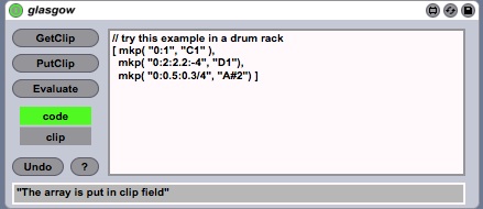 | Description: | Glasgow is Javascript note generator that with the help of Max For Live, can change the content of a Ableton Live clip. See the "help" button on the device for usage. You can write rhythmical clip with this code : [ mkp( "0:1", "C1" ), // Bassdrum mkp( "0:2:2.2:-4", "D1"), // Snare mkp( "0:0.5:0.3/4", "A#2") ] // Hithat Or you can follow two chords (C3 Major then F3 Major, then A3 minor (second degree of C3 Major)) with this : [ mkp( "0:0.5". "C3M:F3M:C3M^2" ) ] Randomly choose different notes : [ mkp( "0:0.75", choose(4, [60, 62, 64, 66]) ) ] The new version includes chords generator and note / time extractor from clip. See the README.md for more info about the format. To avoid spamming maxforlive.com, I will not update the device version at each new version, but the GIT will be up to date. |
