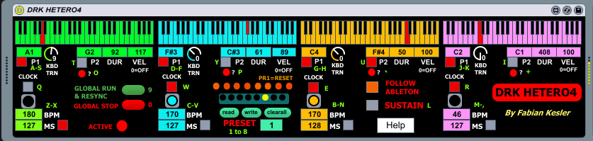 | Description: | DRK Hetero4 is a controlled-auto generative device that creates up to 4 regular rythmic lines, with independent tempo each one so creating a kind of an heterophonic-called musical texture or independet rythms. In addition, you can play freely with that lines from the internal keyboards or remote. Although the meaning of the term "heterophnie" differs according to various authors, traditionally it reffers to the personal ornaments each musician makes on a given melody, getting so a complex result. A contemporary heterophonie (HETERO=DIFFERENT PHONIE=VOICE) could be a musical texture where the internal rythms and harmonies have no simple mathematic relationships as in the pop music in general occur, so they can shift in a non proportional way. The musical lines work as independent entities, so opening a fantastic world for complex perception. You can think a similar case on video or theater where there are various scenes ocurring simultanoeusly…so why no experiment a similar sensation on music with the tools and styles we have nowadays? VIDEO: http://youtu.be/MyJvwEMRaU8 MORE VIDEOS, HELP, ABLETON TEMPLATE, MAX AND STAND ALONE VERSIONS HERE: http://fabiankesler.blogspot.com.ar/p/max-msp.html Author: Fabian Kesler - fvkesler@gmail.com |