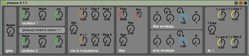| Description: | [hello, this is my first experiment with making a sort of commercial device. any feedback is much appreciated! thank you!] Phawuo is a monophonic Maxforlive synthesizer with special dirty yet antialiased oscilators and nonlinear 24dB/octave filter. Updated v1.1: now includes more modulation controls Demo sound with 24 presets: http://alexnadzharov.ru/maxforlive/phawuo_s_demo1.1.wav older demo: http://alexnadzharov.ru/maxforlive/phawuo_s_demo.wav It features: - 2 oscilators (saw / square) with adjustable pulse width (for square wave) - Frequency modulation sections allows cross-modulation of two oscillators - NEW each oscilator can modulate the clipping amount of another - NEW ring modulation for two oscillators - 24dB/octave nonlinear filter (lowpass and bandpass) - two adsr envelopes with velocity controlled decay and sustain levels - one LFO to control pulse width and oscillator frequencies Tested on Max 6.07 + Live 8 and Max 6.13 + Live 9 Made with gen~ *** First 25 customers can use the "offercode" code to get 40% off *** |