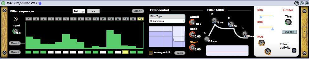 | Description: | Step Filter V0.9 (10th september 2013) ;;;;;;;;;;;;;;;;;;;;;;;;;;;;;;;;;;;;;;;;; an XOX step filter sequencer that tend to simulate a very old analog step filter with a lot of characters (disto, bit reduction, sample reduction). The sequencer is derived from the BIGSEQ plug in from Audiodamage. I also got inspired by the sample reduction (SRR) and bit reduction (BRR) effects from the Octatrack. Be aware that you can really go deep in the filter DISTORTION. ;;;;;;;;;;;;;;;;;;;;;;;;;;;;;;;;;;;;;;;;;;;;;;;;;;;;;;;;;;; ** Use this patch with a BASS note/FX /SYNTH/PAD NOTE to create easily nice sound distortion sequence! ** I advice you to add a limiter after this plug in as you can really go high in the filter distortion. ;;;;;;;;;;;;;;;;;;;;;;;;;;;;;;;;;;;;;;;;;;;;;;;;;;;;;;;;;;; Main Functions - You can change the FILTER AMOUNT for each steps - You can RANDOMIZE the filter velocity and the steps sequence. - You can choose among SEVERAL FILTERS (LP, HP, Notch, LowShelf, etc). - PANIC function - secret panel - LIMITER - SWING - HACK mode (SRR & BRR Octatrack alike) others: - You can change the direction, playing forward or reverse - You can select the speed for each row -> 1/16, 1/8, 1/32, etc. - you can change the length of the sequence from 1 step to 16 steps. - all the functions can be mapped on your favorite midi controller. ;;;;;;;;;;;;;;;;;;;;;;;;;;;;;;;;;;;;;;;;;;;;;;;;;;;;;;;;;;; New in version 0.9 - few gui and code improvements New in version 0.8 (9th september) - I added a SWING function New in version 0.7 - I added a Limiter and Input level - I simplified the GUI (well, at last I guess!!) New in version 0.6 - I remove one of the HACK mode - I rewrote partially the code, and rearranged it for better performances and sound quality. New in version 0.5 - Less distortion (previous versions were including too much distortion in the sound) - New Hack mode (Modulation effect) - Better User Interface (well I guess ;-) ) - Secret Panel ;;;;;;;;;;;;;;;;;;;;;;;;;;;;;;;;;;;;;;;;;;;;;;;;;;;;;;;;;;; Support, Participation & Futures Functions: This plug in is only at is birth .. I am going to update it as soon as possible with more and more nice features (bugs, save patterns, etc). Don't hesitate to leave a comment if you have any issues, request, new features :-) Either use the M4L community, or drop me a mail at egnouf@gmail.com. ///////////////////////////////////////////////////////////// /// /// Support me and donate, a little sum is enough! /// Thanks! /// ///////////////////////////////////////////////////////////// |