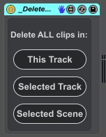 | Description: | A simple utility to quickly delete multiple clips at once. Features: - delete all clips on the track the device is on ("This Track") - delete all clips on the "Selected Track" - delete all clips on the "Selected Scene" If you map the buttons and they behave as toggles (first press deletes the clips, second press does nothing), which happens for example if you map them to your computer keyboard, you can simply open the device, select the three buttons together, open Inspector, change "Bang when transition from" to "Both" and save the device again. USE WITH CARE! Release notes: ---------------- v1.0 - initial release |