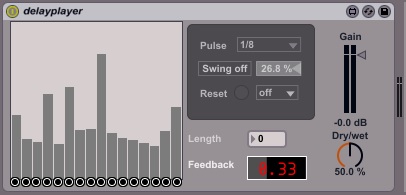 This is a goofy delay with sequencer for really short delay times. It's kind of like the effect you get when you're playing an old-school sampler and play two notes at the same time. There is a subtle flanging. Listen to old Squarepusher tracks to get an idea. Works best with percussive sounds. |