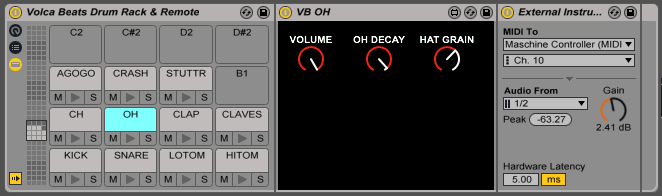Although there are some parameters you can´t control via MIDI, this is quite useful to store patterns in Live, modulate and automate (and mix) all the parameters above. Also works well with hot-swap, enabling you to quickly switch between drum sets.