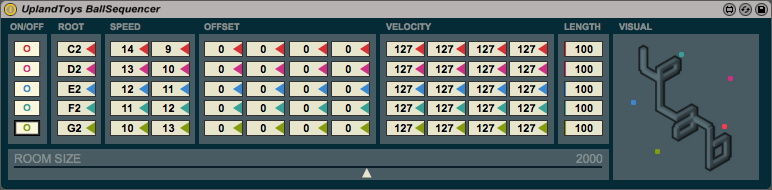 BallSequencer is a sequencer based around the idea of MIDI messages being generated by balls moving around inside a rectangular area. Notes are triggered whenever a ball collides with the boundary of the rectangle. You can set parameters that will control the movement of each ball, in addition to possible note and velocity values depending on which wall is hit. All parameters have a brief explanation which can be viewed by opening the live help window and hovering over the parameters. |