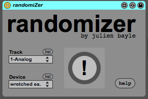 | Description: | ju.randomizer is a max for live device that provides an easy way to create presets randomly. Drop it in a track, choose a track in the first list in which there is the device you want to randomize, then choose the device itself in the second list, then click on the button. It also finds nice names to your future presets. |