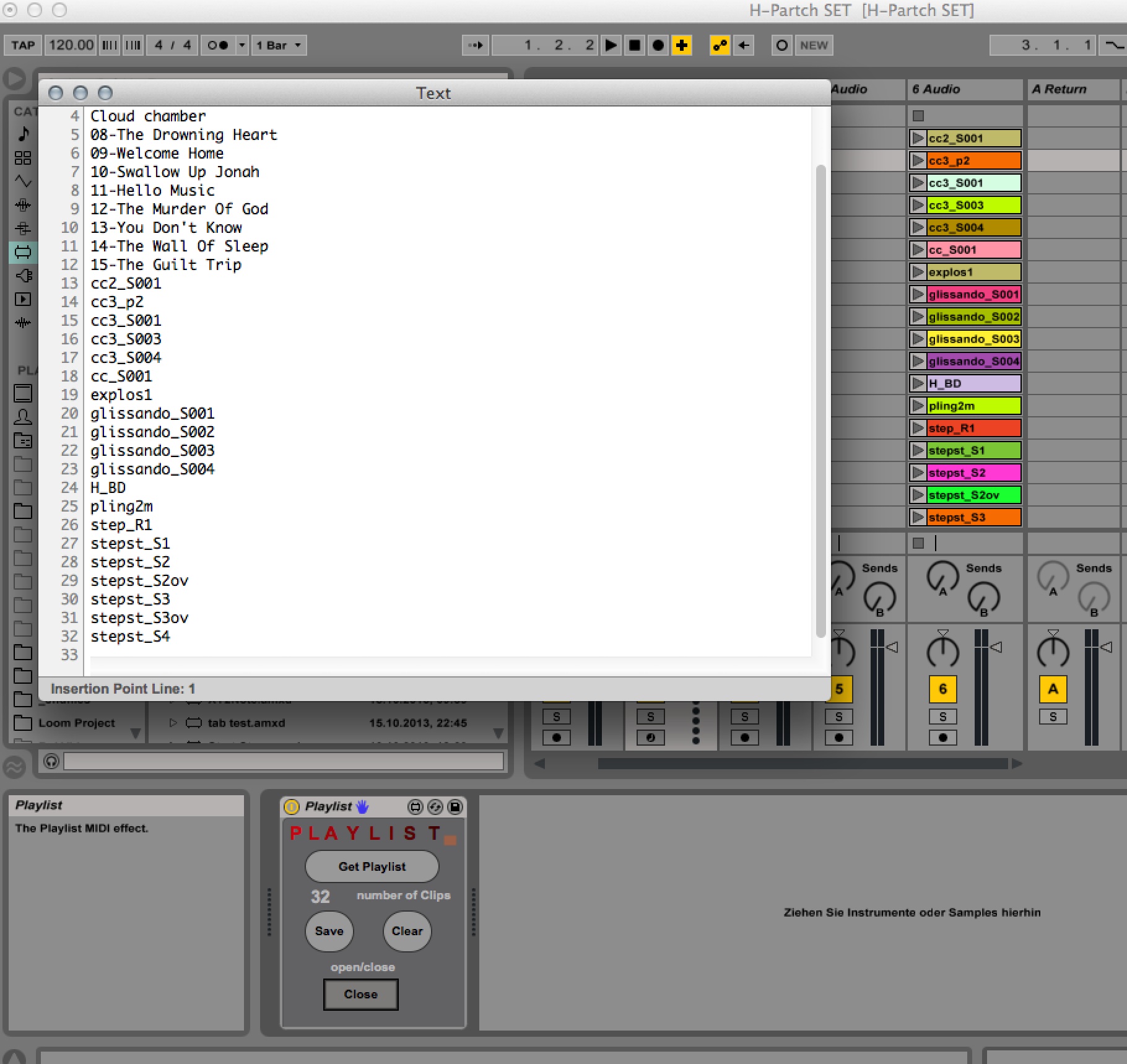 | Description: | Playlist - counts your clips in the session view - writes all clip/file names into a text file - lets you export the playlist as a textfile If you want to share a playlist of files/clips with your friends or fans, this device makes your life easier. |