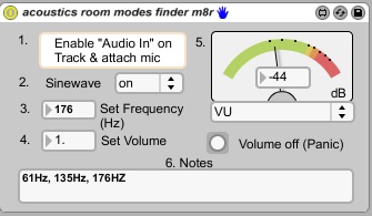 | Description: | acoustics - room modes finder m8r - helps you to find and identify exact frequencies of standing waves / room modes in your studio room - by ear and VU Meter. It is especially useful for bass / low frequencies. 1. Enable audio in on your track 2. Attach a measurement microphone (normal mics will do for test purposes) 3. Set sinewave to ON 4. Change the volume if necessary 5. Change the model of the VU Meter if necessary 6. Shift through the frequency up from 1 to 20k -> you hear loud peaks where the room modes / standing waves are. Note any peaks you find temporarily in the Notes field. For my studio, I have identified three standing waves which I will have to correct now: 61Hz, 135Hz, 176Hz. That's it. |