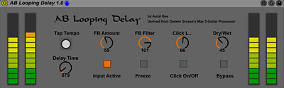 | Description: | Looping delay derived from Darwin Grosse's Max 5 Guitar Processor, ported to Max for Live. Controls should be automatable. Enjoy. |