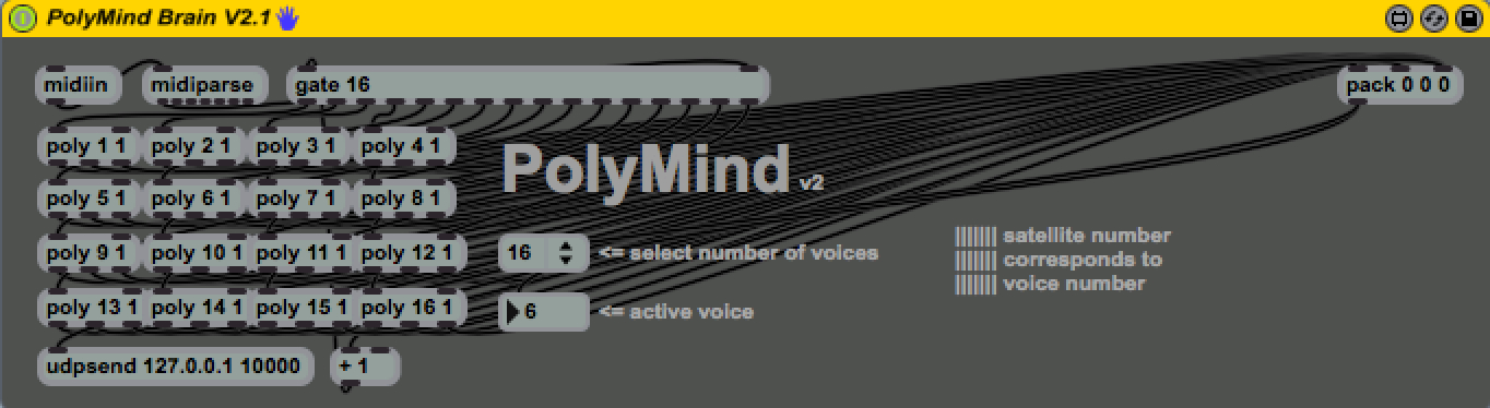 | Description: | PolyMind v2 - Dynamic Voice Allocator Play up to 16 hardware mono synths as a single poly synth using round-robin voice allocation via MIDI. Included in the zip is the PolyMind (Brain) which lives on your master MIDI track and up to 16 'satellite' patches which live on additional MIDI tracks and receive the note data. From there you can route the note data from each satellite to any MIDI channel you choose. Play chords with your hardware mono synths! (Works with soft synths and poly synths too). Send a sequence to several different synths and put different effects on each one. Please read the included txt and give feedback if it works for you because the udpreceive object can be finicky. Thanks!! |