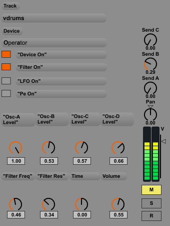 | Description: | Give controll ( 8 Dials 4 Buttons ) over selectet device in selectet track. Du kannst das Patch einfach in eine Midispur laden und los gehts. Als erstes solltest du den Openbutton drücken, nun kannst du die Bedienelemente via Midilearn deinem Hardwaerekontroller zuordnen. Jetzt kannst du jrgendeine Device irgendwo im Liveset anwählen oder neu hinzufügen. Das Patch erkennt die Device am Namen und ladet automatisch die Parameterzuweisungen. Das selbe funktioniert auch mit Presets. Du kannst also z.b. ein Preset des Operators auswählen und ihm eine total eigene Parameterzweisung erstellen und jedes mal wenn du das Preset wider verwendest werden seine eigene Parameterzuweisungen geladen.(Presetname muss angezeigt werden, rechtsklick auf Device und häcken setzen oder entfernen um die algemeine Zuordnung der Device zu aktivieren.) Um eigene zuweisungen zu erstellen einfach eine Device anwählen, dann den gewünschten Parameter anklicken (z.b. Cutoff) und dan auf das gewünschte Namensfeld im Patch klicken und schon ändert sich der Name und die Zuordnung. Die geänderten, selber erstellten Parameterzuweisungen werden im Liveset gespeichert. Fals du deine eigenen zuordnungen auch in anderen Livesets brauchen willst, kannst du auch Presets des Patches speichern und wider laden. (kleines Diskettensymbol in Leiste oben rechts). Das Patch ist in erster Linie dazu da im Liveset immer die wichtigsten Parameter der ausgewählten Device auf den Reglern zu haben. Ich nehme damit hauptsächlich Parameterfarten in den Clips auf. |