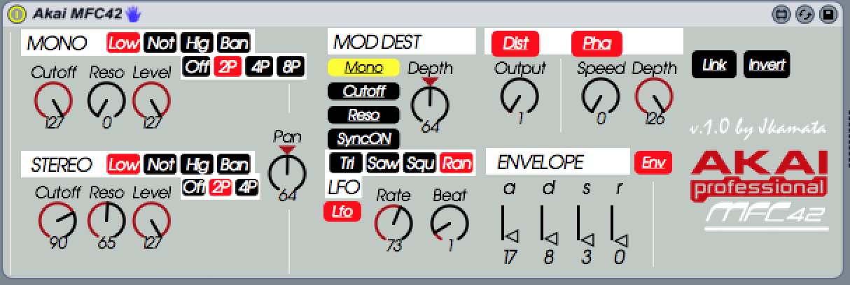 | Description: | Midi cc Controller for the AKAI MFC 42 filter - enjoy :) |