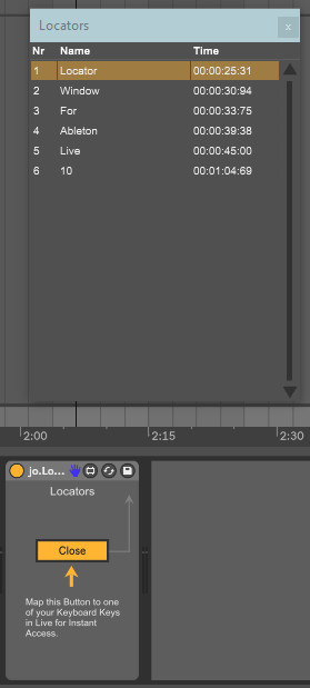 | Description: | Missed this feature in Ableton Live for quite some time so I programmed a solution in M4L. A floating window that automatically updates and shows you all the Locators you created in a session in organized order by time. Also, let's you select locators and have the play-cursor jump to them depending on your global quantization. -- Update 1.5: Fixed some issues that made the colors not update correctly when using the device in Live 10. The table should now change color again automatically when switching Lives theme. Renamed Device to Locators. |