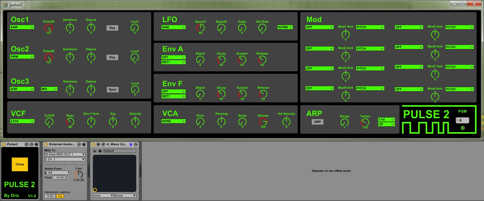 | Description: | Hello, this is my device for control pulse 2. You can control all parameters exept arpegiator. (step accent ect) this is not really bi directional but if you arm the track which it contain, if you moove knob on you pulse the device is updated. but you must define send cc parmeter on your pulse. (Global-->TX PARAMETER--> CC) For pgm Change define the number desired of PGM (1 To 500 ) and Bang in the lower left corner 1.1 minor bug and oblivion fixed :) the value for glide mode is correct now 1.2 Osc1 Shape problem fixed!! lol :/ 1.3 The last destination for modulation it's added! :/ :/ 1.4 unisson detune knob and envA fade knob added |