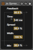 A Stereo Delay with a Spread Parameter that increases or decreases the Time between the Left and Right Delaylines. It's light on Cpu and works nice along with the native Ableton Delays. Also I included an adjustable repitch-time when changing the Delay Sizes, that allows for some interesting effects.
