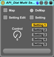 | Description: | Dial multi setting is five memory value setting for an parameter in live. Map any parameter in live and push up the button "Setting edit" moove the dial and push the tab button setting 1, moove again the dial and push setting 2 ect for five settings. When is finish push down "Setting edit" and now you have five setting for your parameter. you can automate the tab. |