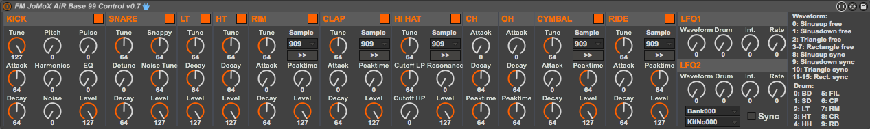 | Description: | Max4Live control for the JoMoX AirBase99. The JoMoX AirBase99 control uses CC messages to control the drum synth parameters in real time. This drum machine sounds amazing, and having 'knob' control really takes it to the next level. Plus, since the knobs are Live objects, you get all the automation and storing features for free! Also included are Bank / Kit selection menus and a sync button. The sync button re-sends all knob data to the JoMoX, which is handy if you just loaded a new kit and want to get back to the settings you had before. * 2016-11-23 * New in v0.8 * - BIG UPDATE! Many many thanks to Jojo for figuring out how to get parameter changes from the JoMoX into Live! Now, with a little configuration work (details below) you can enjoy true bi-directional goodness! Please let us know if you run into any issues. Since m4l only keeps the most recent device version, you can find earlier versions here: http://bit.ly/2gmPtg9 Instructions to get bi-directional messages working: - Connect MIDI OUT from the JoMoX to your computer / audio interface MIDI IN. Be sure to also route that MIDI to the track with this m4l patch in Live. - Enable "Snapshot Send" on your Airbase, please read the manual how to do that: page 13 on the bottom. - You can also enable the "Transmit Controller" option and the JoMox will send the values when changing them directly using the value knob. * 2014-11-28 * New in v0.7 * - Sample Select + Reverse for Rim Shot, Claps, HiHat, Cymbol, Ride (thanks bollum) * 2011-04-06 * New in v0.6 * - LFO controls (thanks Basmund) - Better parameter naming for easy automation - Mute buttons (gray = muted) - Bank / Kit select bugfix |
