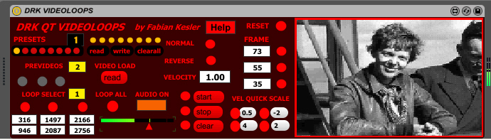| Description: | DRK VIDEOLOOPS is a software wich makes easy-access loops from preloaded videos, or by videos loaded by you. Sound from videos is enabled. It is made with quick time libraries, so mov and mp4 videos are prefered. Ideal to make audiovisual works, making relationships between video and audio. You can change direction, velocity, loop points on 3 banks, frame access to use as image device and you have acces to the audio track of the video, with switch and volume control. It has in 3 versions: Ableton Max For Live, Max and exe versions (mxf for Mac). VIDEO TUTORIAL: http://youtu.be/MCVpTg3_82k See the HELP box inside DRK software for details about using. MORE VIDEOS, HELP, ABLETON TEMPLATE, STAND ALONE (MXF) AND MAX VERSION HERE: http://fabiankesler.blogspot.com.ar/p/max-msp.html Author: Fabian Kesler - fvkesler@gmail.com EMAIL: fvkesler@gmail.com WEB: www.fabiankesler.blogspot.com |