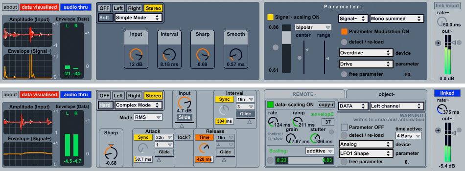 to best understand it it is worth trying this simple experiment: load an audio drum loop on to an audio track. then load a 'utility' device onto that track. then load 'Anti-lope' onto that track BEFORE THE 'UTILITY' DEVICE. then in 'simple mode' map the 'parameter' controller (using the menus) to the utility gain you loaded earlier. now play your drum loop. the crucial thing here is to play with the 4 controls - input: this is how much level you will send to the envelope following device / interval: this is how fast the follower will work (shorter times = faster) / sharp + smooth: these affect the shape of the envelope data - a bit like a compressor - sharp is the 'curve' effectively, smooth is like fade time.