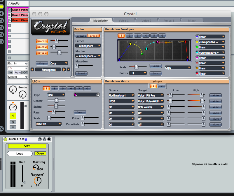 | Description: | Monophonic audio input to Midi audiounit synth. (OSX only) Put it on an audio track. Select a synth plug-in from the umenu. Plug your guitar, bass, voice or whatever is audio. Play. Version 1.1: -You can now choose between au. and vst. -Knob for analysed audio frequence threshold tweeking. I've freeze the device but I'm not sure I've did it well. So, just in case: You'll need sigmund~ and audiounit~ externals. For sigmund~ : http://crca.ucsd.edu/~tapel/software.html For audiounit~ : http://cycling74.com/forums/topic.php?id=25316 |