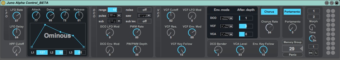 chronopolis, I struggle with the same issue and can't seem to figure it out. My Juno only responds to portamento, sometimes to program changes, the m4l device reflects the changes made on the Juno itself. But I can't get the m4l device to control alpha juno properly. What do you mean by Juno being on the Channel 1? Mine is set to channel 1, the omni setting is on, in ableton the corresponding midi channel is set with midi out of the corresponding output of my interface and with MIDI channel 1. Still nothing.
