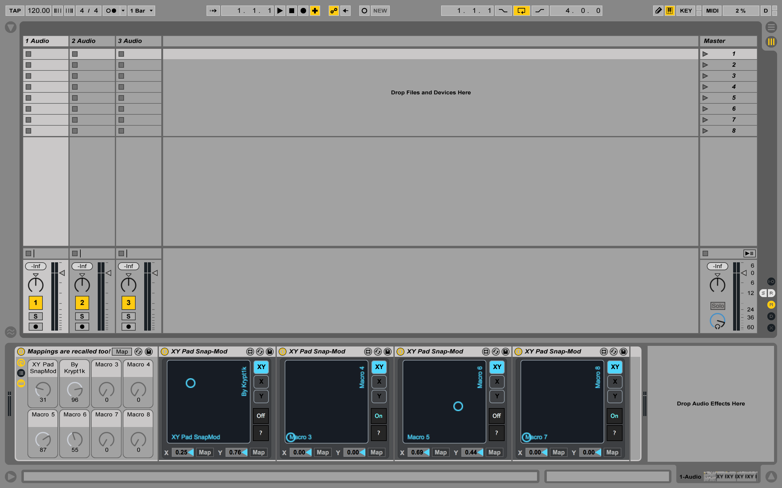 | Description: | A modification of Ableton Live 9's stock XY Pad. This alteration adds a toggle that when enabled, will cause the XY Pad and any mapped parameters to snap back to zero (upon lifting your mouse). Modulate various parameters, then instantaneously reset them back to zero just by lifting your mouse. This device is brought to you free by Krypt1k. https://www.youtube.com/watch?v=uH4T7qd00uU&feature=youtu.be http://www.krypt1k.com/krypt1k-labs/ Ver 1.0 Initial release. |