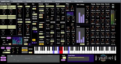 | Description: | Polyphonic analog synth emulation with polyphonic arpeggiator and chord generator. Fixes Godel 2 bugs; adds 37 new oscillator types; improved 5D SV ffilter. Features Top-quality audio * First audio instrument built entirely in gen~, for complete internal 64-bit operation * Custom antialiasing and 3x oversampling * More than 150 automation parameters Modular modulation matrix * Six assignable polyphonic modulations with individual level control for each matrix selection * 21 sources, including envelopes, LFOs, gate levels, voice number, oscillator pitch, and external MIDI controllers * 37 destinations, covering all main audio parameters. Custom oscillators * 2 complete oscillators with variable mix and ring modulation * 37 oscillator waveforms, all with variable shape Unique anti-aliasing with the newest technology FM, sync, and FM feedback on all oscillators * Graphical pitch tracking, graphical FM tracking, and wave display 12/24-dB/octave filter * Variable mixing mixing of poles, saturation, and drive * Graphical pitch tracking * unfiltered oscillator mix with variable oversaturation * table-based gain compensation across six dimensions LFOs * Two polyphonic LFOs with gate sync option * Sine, pulse, saw/triangle, and S&H waveforms * Adjustable waveform shape and frequency * Polyphonic spread by frequency or amplitude Envelopes * Two ADSR envelopes, one with single, multi, and repeat modes * Graphical gate velocity sensitivity * Attack velocity sensitivity * Pitch slope modulation Stereo effects * Phaser/flanger * High-quality chorus * Ping-pong tempo delay * Efficient reverb * Custom fast-response limiter Keyboard * Direct, stored note, and pitch transposition modes * Multicolor display * Notes may be stored in the preset and recalled in the same order played * transpose, scale remap, mod wheel, and sprung pitch bend. MIDI input * Note on/off, program change, mod wheel, pitch bend, volume, all notes off, all sounds off, and MTC start/96-clock/stop signals Arpeggiator * Sequences notes in the order played, with adjustable rate * The arpeggio may either adjust to the number of notes on, or with fixed note count, allowing new notes to substitute into the arpeggio * Hold mode allows including multiple notes with the same pitch in the arpeggio * Notes are stored in the sequence played * Notes are fully polyphonic with adjustable duration (notes may overlap) * Keyboard input in direct mode may play along with the arpeggio * Adjustable rate, syncs with external clock Chord generator * May add chord notes to directly played notes or arpeggiated notes * Adjustable velocity response and duration for each note in the chord adds realism * Pitch remapping to different keys with sophisticated note cache system to track note-off events even when remapping is changed while a note is on, for either direct notes, stored notes, or both * Arpeggiated chords may have variable and intervals and patterns Auto Sequencer * Simple way to build long song sequences with minimal effort * Simply switches to next preset after the number of chosen bars, when enabled and clock is on Custom voice allocator * Optimally assigns notes for best quality when CPU resources are low, with complex note age adjustment both for note on and note-off events Presets and preset bank management * Loading and saving of external preset files * Single-click recall, save, and delete of 128 programs * Last session state restored when starting a new session * Text comments stored with each preset Open component design You may find in-depth documentation on prototypes of the design internals on this site There is no license. I simply request acknowledgment in using this for your music or own designs, out of common courtesy and in aspiration for something better. |