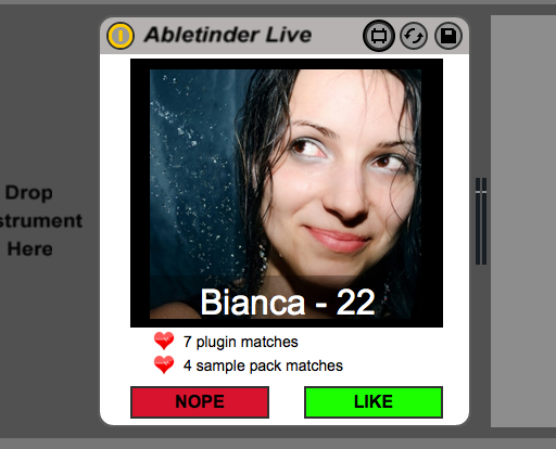 | Description: | Abletinder Live is a real time hook up service for producers and DJs looking to meet that special someone. Once the patch is open, you are presented with a selection of other users who are currently online, allowing you to either "Like" or "Nope" them. When you first run Abletinder Live, it quickly gathers various information about your production habits and finds appropriate matches from our growing database off current online producers and DJs. If you "Like" someone who has "Liked" you back, you will be instantly connected with them via chat, where you can take the conversation in any way which you please. Simply download and open the patch on any Audio track, (or your Master Track) and start matching! Good luck. |