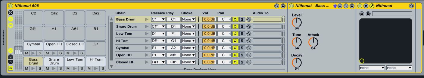 | Description: | This is Datengeist's Drum Rack for D16 modified for D16's Nithonat 606 emulator. This device lets you sequence the Nithonat VST with Ableton's drum rack sequencer on push. All credit should go to Datengeist for making these axmd's. All I did was rename and remap the controls to work with Nithonat. Unzip and copy the folder to your user library. Turn off internal sequencer You may need to manually point to the axmd files Import the mapping file included in the folder if necessary. Post in the comments if you need and help. Thanks again to Datengeist for making the original devices and helping me learn m4L. |