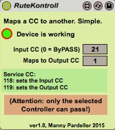 Routes a CC to another and only this CC can pass. All other MIDI-Informations passes thru without alterations. The In and the OUT CC can be remotly controlled over the service CC 118 and 119. Best in combination with KontrollRute. |
