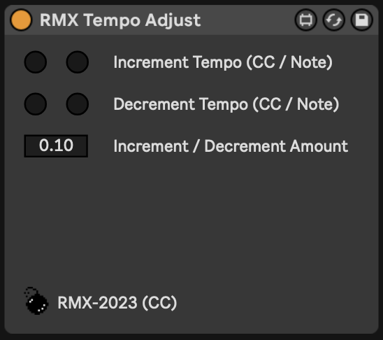 | Description: | A small utility that allows mapping of controller buttons / keyboard keys to increment / decrement tempo. There are other ways to achieve this, however for those with M4L this seems easier and more flexible. Obviously not very generic, but can easily be modified to increment / decrement other live parameters in a similar way. Just drop it on any track and map the two buttons. - Update 1.0.1: I've added a second set of buttons that react to the 0 -> 1 transition only - choose the ones that work best for you - Update 1.0.2: Converted to M4L audio effect, so you can place it on any track |