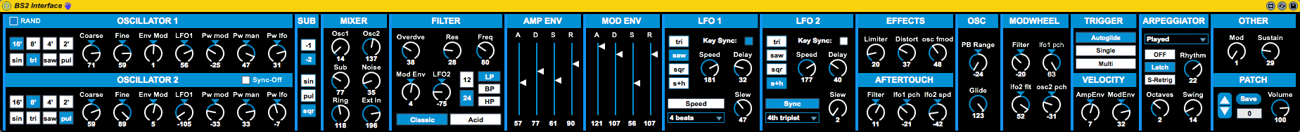 2. If you want the device to display the settings of a preset that is saved on your BS2 (and not on the M4L device itself) when you change patch-number, then that feature is not supported by my device -> I had to choose between importing presets from BS2 to the M4L device or sending presets from the M4L device to BS2, and I chose the latter because a lot of my friends own a BS2, and so I found it more interesting to be able to recall my presets on any BS2 from within Ableton Live (so I don't have to carry my BS2 with me every time I go jamming at their house...)