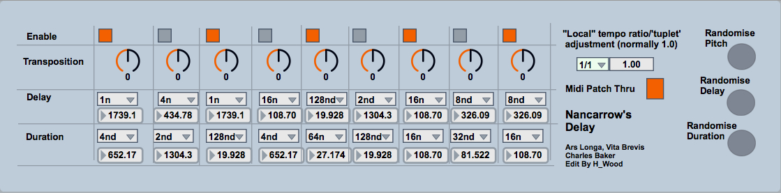 | Description: | Just an edit of the original with: Stuck note issue resolved Added randomisation per function Fixed passing of values to other instances The original is at: http://www.maxforlive.com/library/device/174/nancarrows-delay Original by Ars Longa, Vita Brevis, Charles Baker |