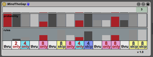 | Description: | "MindTheGap" is an interactive note supressor for MIDI streams. This can add a lot of variation to short MIDI clips. Gates are applied to note-on messages according to a random probability value and a choice of rules. Rules are applied on cycles of measures, allowing notes to pass through only on certain measures. For example, if you set a rule to "only 8", the notes at that time will pass only on the 8th measure. If you set it to "skip 4" the notes will be blocked every fourth measure. Additionally, you can set a probability for a gate, so if the probability is 50% and the rule if "every 16th", the notes will be blocked expect on the 16th measure, at which point, notes at that time have a 50-50 chance of playing. |