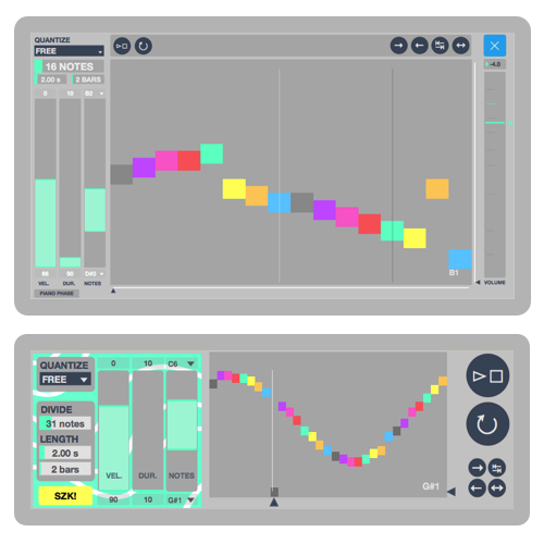 | Description: | Midi Loop Drawer is a simple sequencer made to draw and create loops of MIDI notes. Choose the loop’s length (in seconds or bars), choose the number of notes you want into the loop, define ranges for velocities & notes duration, then Draw and play ! Two versions are included : embeded into tracks effects’s area / wide screen standalone window. #Device location Put the device on a midi track before a midi instrument. #Trigger loop Set the trigger mode : free or quantized (choose the quantization). Quantized implies to start the Ableton Live’s transport. #Number of notes & Loop’s length Set the number of notes you want into your loop (from 1 to 128). Set the loop’s length in bars or seconds (from 0.5 to 15 seconds, or from 1 to 32 bars). Play with these values when loop is running for cool effects. #Drawing range Define the lowest/highest notes you need to draw. #Velocity & Duration ranges Velocity : from 0 to 127. Duration : from 10 ms to 1.5 seconds. Random values will be triggered for each note when loop is playing. Setting same min and max will lead to fixed value (no random). #Buttons Play / Stop (Play depends on free or quantized mode). Resync : re-play loop. Directions : Forward / Backward / Ping-Pong including bounds / Ping Pong excluding bounds. #Horizontal & Vertical selectors Select and remote notes. Useful for midi control. #Track’s volume control A slider to remote the track’s volume is available for the standalone version. #Midi mapping Numboxes, buttons and sliders are mappable. #Trick Notes’s colors are repeating each 8 notes. Ex : grey will appears for the 1st, 9th, 17th etc …, blue at 8th, 16th, etc … easy way to find which note is playing at which moment of the loop ! ______________________________________________________ A video about this device : https://www.youtube.com/watch?v=itU22gI_pno ______________________________________________________ For more information please visit : http://flo.szk.fr/m4l/ ______________________________________________________ Here is a short exploration of the famous piece Piano Phase from Steve Reich with 2 x devices :) https://www.youtube.com/watch?v=Xmn0o7a28pc ______________________________________________________ |
