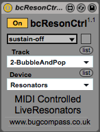 | Description: | A Max For Live device that converts MIDI note on / off messages from an external keyboard or internal MIDI clip into control parameters for Ableton Live's built in Resonators effect. Instructions ------------ 1) Place the device on the MIDI track that contains the source of the MIDI you want to use to trigger the effect. 2) Select the specific instance of the Resonators device you want to control using the display's menu. 3) sustain-off works as version 1.0. The number of keys pressed turns on and off the individual resonators. sustain-on ignores the number of keys pressed, so once an individual resonator is open, it will stay open until the menu is returned to sustain-off. fully-open immediately turns on all resonators until the menu is returned to sustain-off. 4) Sustain pedal on / off (cc#64) will affect the sustain menu. You can invert the pedal polarity with the button. Note: Again, the range of Live's Resonators is limited, so notes lower than C-2 and higher than C5 will cause them being output as C-2 and C5 respectively. Given the pitches concerned are fairly extreme under normal circumstances this should not be a problem, however if requested by users, this will be corrected in the next update to them being ignored entirely. Updated in this version ----------------------- 1) Added a sustain menu to filter out note off messages. 2) Included external sustain pedal control. Older versions -------------- http://www.bugcompass.co.uk/bcResonCtrl1.0.zip Copyright --------- You may used this device freely in your audio production work. You may use or adapt the contained Max/MSP patch for use in your own patches for personal use only. Redistribution of any patches containing all or part of this patch is permitted for non-profit purposes only, as long as the original author is credited and the original patch and this file are included each time. Use of this patch in any form for commercial use or profit is not allowed, without the original author's written permission. ____________________ www.bugcompass.co.uk |