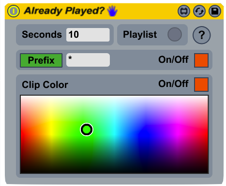 | Description: | Ever had the problem remembering which tracks you already had played after several hours of DJing? This device changes the color of a playing clip and adds a prefix / suffix to the clipname after a predefined period of time, so you can easily recognize which clips have already been played. In addition, it also keeps track of all played clips in a playlist (which you can export as a textfile). ============================================= This device has been made available thanks to the Japanese Sound&Recording magazine as part of an ongoing series of articles about artists using Max-for-Live devices: http://port.rittor-music.co.jp/sound/magazine/maxforlive/13885.php (in Japanese). ============================================= |