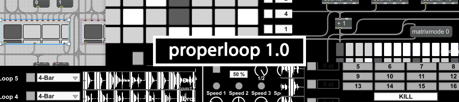 | Description: | Properloop is a versatile loop compositing system for Max for Live/Ableton live. All loops run together in sync while grid based sequencers allow audio from each loop to sound in time allowing for the creation of unique and interesting rhythmic patterns. See the product page for further details and video demonstrations. https://sellfy.com/p/M1WR/ *Note* Now included in the purchase/download is a copy that functions flawlessly in Max 6.1 minus the new timestretching available in Max 7. Still matches loops to tempo automatically. ***9/12/15 UPDATE*** I have just finished work on an update that is now available for purchase and download. Addressed a few user requests, adds a couple new features, and overall performance has been improved. The Max 6 version has also been updated. For an overview of the update, watch the following video: https://www.youtube.com/watch?v=lrFzHat2m40 1/20/16 Update: Updates for both Max 6 and 7 versions: -Updated the delay effect's sync to more closely resemble a traditional sync delay. -Updated the reverb effect which is now MUCH better quality. Bugfix for Max 7 version: -Sequences 10 and 16 would not initialize properly from default patch. Also, I am now selling via sellify. |