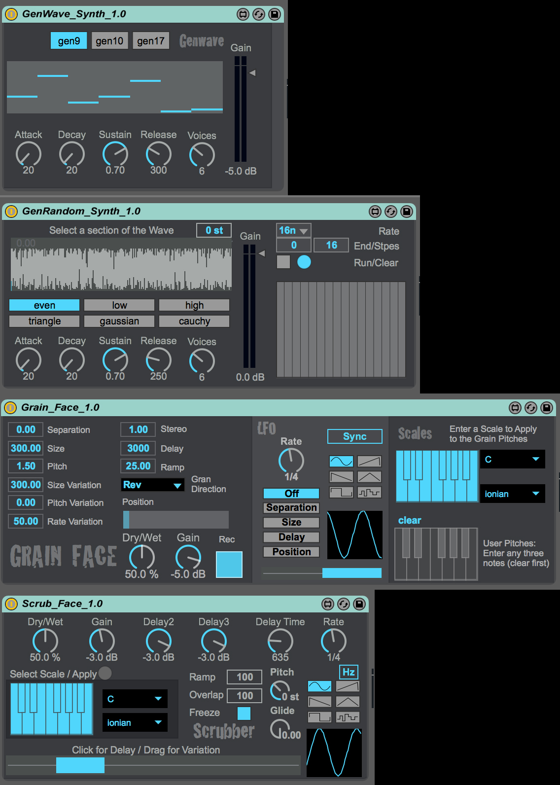 | Description: | • GenRandom Synth - An algorithmic wavetable synth. Random numbers are generated according to one of six probability algorithms. • GenWave Synth - Exponential b.p.f. wavetable generator • Grain Face - Takes a signal input and granulates it, allowing for different transposition and granular sampling effects. Multi-purpose LFO allow realtime manipulation of varied parameters. Various scale (pitches) can be applied to the grains. • Scrub Face - Variable rate delay lines with overlapping (to avoid clicks) and ramping (between delay amounts). LFO applicable to delay amount, pitches can be applied to the 3 separate delay lines, two of which you can control the gain. |