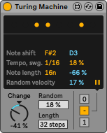 | Description: | Turing Machine is a random looping sequencer for the M4L platform. This device is highly influenced by the fantastic work of Tom Whitwell, the DIY Eurorack Turing Machine : http://musicthing.co.uk/modular/?page_id=21 https://www.youtube.com/watch?time_continue=101&v=QLy7qtZ02tk https://www.youtube.com/watch?v=BjB4kYffTI8 Version History : 3.o1 - Click on the device logo now shows numbers instead of sliders. 3.o2 - Updated to Live 10. (Important! If you're still using Live 9, please, stick with the old version! There are major UI changes in Live 10, these will look ugly under 9) 3.o3 - user request : trigger TM with MIDI notes 3.o4 - user request : full MIDI mapping 3.o5 - device now passes through MIDI messages, thanks to a kind user who pointed out the missing objects! 3.o6 - fully new clock generator, more stable and reliable 3.o7 - MAP function fixed 3.o8 - Ableton banks support added for Push, improved clock, now 100% message/bang based, no more signal conversion, note lengths are now in time intervals 4.oo - new UI, updated core, pulses expander! 4.o1 - Shift + Click on logo to send mail to the developer 5.oo - updated UI, expanded mapping possibilities 5.o1 - UI fix 5.o2 - Apple silicon check 5.o3 - fixing a silly issue with 16 steps locked (thanks Mat!) 5.o4 - simple fix 5.o5 - minor UI update 5.o6 - Live 12 compatibility check |