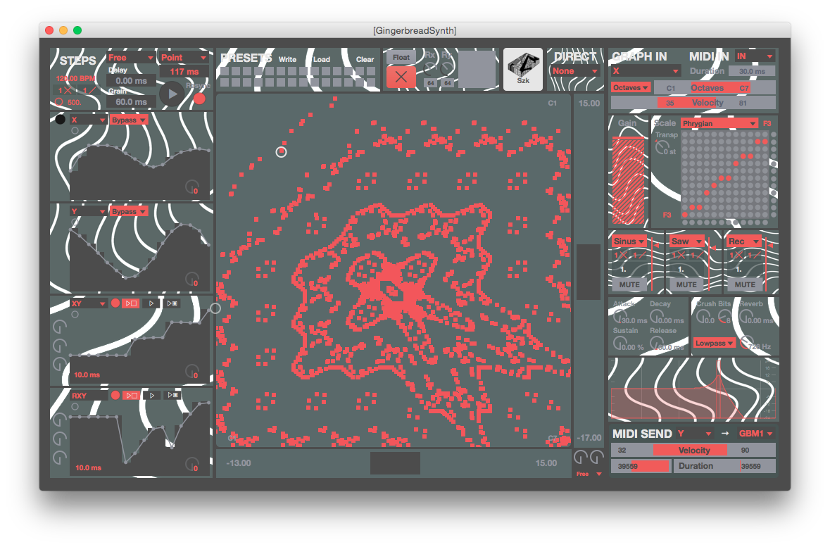 | Description: | GINGERBREADSYNTH is an auto-evolutive fractal synth based on the Gingerbreadman algorithm. Patterns can be generated and repeated at different scales allowing you to produce a wide range of musical sequences. The synth includes 3 oscillators, 1 ADSR and a Effect Chain (Bitcrusher, Reverb and Filter). A Note Scaler allows you to easy create melodies to fit your project. Grips with Envelopes make the synth semi-modular and introduce the possibility to play with retro-feedback on the synth parameters, or to modulate effects and devices on other tracks. A Midi Send feature is included to send midi notes to other midi Instruments. UPDATE v1.1 # New feature : « Auto Mode ». This function allows you to start a metronome that add or remove (or randomly add/remove) a certain quantity to the X-Y values, with an amount picked up randomly from 0 to 25%. With this feature the patterns can change automatically, jumping from one scale to another without interaction, letting the synth autogenerate variations. ______________________________________________________ Videos about this device: https://www.youtube.com/watch?v=ROv5Qk41eq4 https://vimeo.com/137305397 ______________________________________________________ For more information please visit : http://m4l.szk.fr/ ______________________________________________________ # GRAPH The algorithm generates points that converge/diverge and draw progressively Gingerbreadman patterns. Clicking on different parts of the graph will create new starting conditions and the Gingerbreadman will be drawn at a different scale than previous one, making it fractal ! The graphs runs from -100 to +100 on both X-Y axes (no specified unity). You can restrain the graph to lower boundaries by using the sliders, that will lead to rescale the patterns and allowing more precision at smaller scales. The algorithm generates (X,Y) points and their coordinates are used to produce Midi Values from 0 to 127. So whatever the scaling you use, what you see on the graph will be values between 0 and 127. Top and Left are 0, Bottom and Right are 127. # GRAPH IN VALUES The graph produces X-Y values that will be scaled between 0 and 127. Additionaly to these values, other ones can be used. Here is a quick resume : • X : x coordinate • Y : y coordinate • XY : mean of x and y coordinates • RXY : distance between the point R(Rx,Ry) and (x,y). • K : value coming from an external keyboard (or computer one). • KXY : distance between K value and XY value. • KR : distance between K and R. # MIDI IN IN / None : IN will allow you to play with an external keyboard in parallel of the algorithm. NONE will disable the external notes to come into the synth, but you will be able to use them for K, KXY and KR values. *** Note : if Midi IN enable, its values will NOT pass trough the Octaves Scaler, Velocity Range, and Notes Scaler. These will remain values set by your keyboard. # DIRECT None / XtoFreq / YtoFreq / XYtoFreq : experimental feature that skip the midi translation (that create notes) and produce direct frequencies from the graph values. Bypass/Octaves will act these values : Bypass will mean that graph boundaries will be 10 and 12500 Hz, Octaves will lead to clip frequencies to the selected octave range. # STEPS • Free / Quantize : launch the algorithm freely or quantized (Global Transport must be running in this case). • Point / Ramp : produces new point at each step, or ramp between the previous and the new point. Adjust the step duration accordingly. • Duration : from 10 ms to 60 seconds. Values below 50 ms may lead to CPU/Interface overload, depending on your system. • Start / Stop / Resync : start/stop algorithm. Resync allows you to restart (can be usefull to fit the global transport again after many processes on the synth). • BPM : display the current Live Set BPM • Cross / Divider : adjust quickly the step value in function of BPM. X times faster or X times lower, then the resulting duration will appear, and just hit the led button to apply. • Ramp Grain : grain duration when using Ramp Mode. From 10 ms to 10 seconds. • Delay : additional random delay applied to the algorithm. When running, the next value will be delayed by a random value picked up between 0 and the entered value. From 0 ms to 60 seconds. # PRESETS Important ! Presets won’t be saved into your Live Set. Please use write/load to manage .maxpresets files. # FLOAT Make the window floating or not. # CLEAR Clear the graph. # R POINT Additional point that can be used by the synth. Click on button to make it appear and move it to new position. # NOTES FUNCTIONS • Duration : time transition between Note-on and Note-off. From 5 ms to 60 seconds. • Bypass / Octaves : in Bypass mode, notes are values from the graph between 0 and 127 (wide range), in Octaves mode, notes are restrained into Octaves range. • Velocity Range : Velocity picked up randomly into the range at each note. • Scaler : Scaler reproduces the presets available with the Ableton Live Scale midi effect. Input and Ouput notes are displayed. You can also Transpose notes from -36 to +36 semitones. # GAIN A simple gain applied to the general output volume. # OSCILLATORS Three oscillators can used and mixed together to produce the synth signal. Available signals are : Sinus, Triangle, Sawtooth, Rectangle, Pink and White noises. Each have its own level gain and mute. Cross / Divider allows you to quickly adjust frequencies to X times higher or lower than the note frequency. # ADSR ADSR applies to the signal created by the three oscillators. # EFFECTS / EQUALIZER A Bitcrusher, a Reverb and a end-chain Equalizer are available. # MIDI SEND You can select which value to be send through Ableton Live. Select a Midi Send Output and use the Midi Receiver device on any midi track to receive notes from the synth. Octave will be set by the choice on the Bypass/Octaves Menu. Send Velocity and Send Duration are used to create midi no