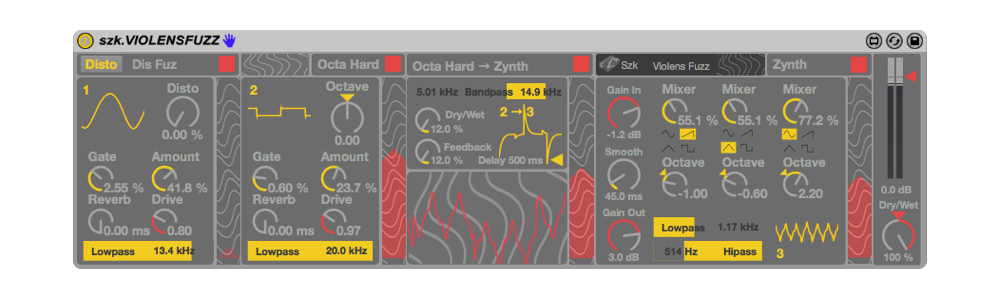 | Description: | Triple Fuzz Effect : classic disto/fuzz, octa-fuzz and fuzz synth. Use them independently or mixed together. DISFUZ one allows you to design sounds from soft distorsions to noiy clipped fuzzes. OCTAHARD acts as a kind of hard octaver and its signal can be send to the ZYNTH. This one tracks the pitch from audio input and use it to feed 3 oscillators with independent octaves options. When sending OCTAHARD to ZYNTH, its signal mixes with Audio In to produce perturbation and feedbacks leading to harsh noise or cool funky sounds. Low, Hi and Bandpass filters and Signal Windows are included on the different modules to display signals and help you shape some really cool waveforms. ______________________________________________________ Videos about this device: https://www.youtube.com/watch?v=ILs3NssikRI https://vimeo.com/137895195 ______________________________________________________ For more information please visit : http://m4l.szk.fr/ ______________________________________________________ IMPORTANT : Because of the retune~ object you'll need Max 7 to run this device. # DIS FUZ Click on the top left button to switch. Distorsion amount applies to Disto Mode. Gate and Amount applies to Fuzz Mode. Reverb runs from 0 to 1000 ms, and is cut at 0 ms. Drive runs from 0 to 10. Value at 1 means neutral drive. Filter Slider : a Lowpass filter from 20 Hz to 20 kHz allows you to cut high frequencies. Volume Mixer : amount of distorsion into the mix. Solo : be careful with the volume level before clicking ! # OCTA HARD No distorsion here, only fuzz. Octave runs from -4 to +4 (-48 semitones to +48 semitones). Gate and Amount applies to Fuzz. Reverb runs from 0 to 1000 ms, and is cut at 0 ms. Drive runs from 0 to 10. Value at 1 means neutral drive. Filter Slider : a Lowpass filter from 20 Hz to 20 kHz allows you to cut high frequencies. Volume Mixer : amount of distorsion into the mix. Solo : be careful with the volume level before clicking ! # OCTA HARD to ZYNTH This module sends and amount of OCTA HARD signal into ZYNTH. The signal doesn’t pass trough the general mix, to monitor what is send you can click on the Solo button (for your hears and your audio system take care of the volume level !). Delay runs from 0 to 1000 ms and is made to create messy feedbacks to be send to ZYNTH. Filter Slider : a Bandpass filter from 20 Hz to 20 kHz allows you to filter a selected frequency band. # ZYNTH This module use the retune~ object from Max 7 to track the pitch from the audio input and to use it into a synth. Gain in : adjust in function of your audio input. Smooth : smooth the pitch tracking from 0 to 500 ms. Three oscillators are available, with 4 waveforms (Sin, Saw, Tri, Square), that you can mix together and pitch thtrough Octave knobs. Filter Sliders : a Lowpass and Hipass filters from 20 Hz to 20 kHz allows you choose between cuting high or low frequencies. When using injection from OCTA HARD, the Gain In can be used to balance the mix between signal coming from audio input and signal from OCTA HARD. |