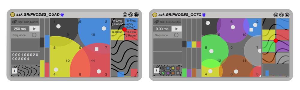 | Description: | Grip 4x/8x Ableton Live's parameters and to remote them in a XY area. A sequencer is available to let you write your own XY sequence and play it like a loop. Two versions are included : 4 nodes and 8 nodes. This device has been made to manage quadriphonic audio routing through Live Sends but its use can be extended to any other modulable parameter. ______________________________________________________ Videos about this device: https://www.youtube.com/watch?v=qQELXWrx3cQ https://vimeo.com/138609865 ______________________________________________________ For more information please visit : http://m4l.szk.fr/ ______________________________________________________ # GRIP Click on the red button to make the Grip lock/unlock buttons appear. Proceed one after one. Click on L to unlock (the button turns green, it’s unlocked). Clik on Live’s parameters to grip them. The parameter’s name should appear. Once it’s done, click to relock and continue with others. # NODES The modulation will be function of distance from point to Nodes’s centers. Nodes can be moved and you can modify their radius. # SEQUENCE Numbers over the plot indicates possible points of the sequence. Type a sequence (numbers separated by spaces), choose a step value and press start. |