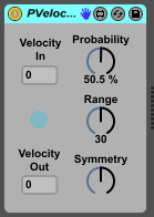 | Description: | PVelocity V1_1 Changes the velocity of an incoming note by probability. Probability dial: Probability of the velocity change of the incoming note. Range dial: The range of of the possible velocity change (0-Range dial value). A value from this range is sampled randomly. Symmetry dial: How a value from the Range is applied to the velocity of the incoming note. Dial full left: Range is substracted from the incoming note. Dial full right: Range is added to the incoming note. |