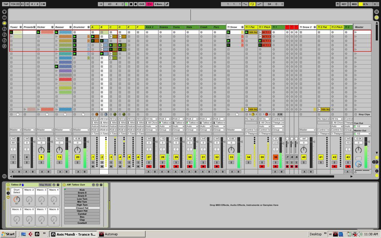 | Description: | This device takes any incoming MIDI note and outputs a single note which plays a different drum sound in Audio Damage Tattoo. The chooser chooses the specific note. Best when loaded up one per MIDI channel in a group of MIDI channels all routed into the Tattoo plugin. Put Tattoo Gun in a MIDI Effect Rack and assign a macro knob to the device's drum sound chooser for further control. The code can be easily modified to work with other drum synths and drum racks if needed. |